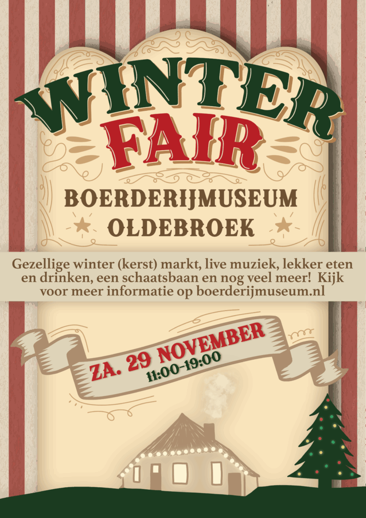Voor de vierde keer organiseren we: de Winterfair. Het programma tijdens deze fair voorziet in een ouderwetse boerenmarkt met meer dan zestig verkoopkramen. De kraamhouders bieden allerlei uitéénlopende waren aan. Dat loopt van brocante tot gebruiksartikelen en van bodyverzorging tot plaatselijk gebrouwen bier. Natuurlijk zien we het thema ‘kerst’ op veel kramen terugkomen. Voor de kinderen zijn er diverse activiteiten. We noemen de draaimolen, ponyrijden, de suikerspin en popcorn, ouderwetse kinderkermisattracties, maar vooral ook onze prachtige grote schaatsbaan. Schaatsen zijn aanwezig en het is gratis. Lekkere winterkost hoort er natuurlijk bij. De bekende vers gebakken oliebollen, snert en pannenkoeken mogen natuurlijk niet ontbreken. Maar daarnaast zijn er nog diverse andere lekkernijen te verkrijgen in onze overkapte kerstherberg of in de tent. Op de fair kun je nogal wat ‘eigenaardige types’ tegen het lijf lopen of mensen in passende oude kledingstijl. Gedurende de gehele dag zijn er muzikale liveoptredens door diverse uitvoerenden (o.a. Kithara, Chapter 4, duo Oldeveld, 2FINE en Muziek Dichtbij duo). De organisatoren van het Boerderijmuseum, zien de Winterfair Boerderijmuseum 2025 helemaal zitten. Bij de vorige edities sloeg het evenement meteen goed aan en waren er vele bezoekers. De reacties waren zeer positief. Op de markt werd prima verkocht. Marktverkopers, mensen die het leuk vinden om typetjes te spelen of in sfeer aangekleed op bezoek te komen, kinderen die leuk muziek kunnen maken (opbrengst in de pet) zijn van harte welkom. Wel aanmelden via 0525 631457 of info@boerderijmuseum.nl